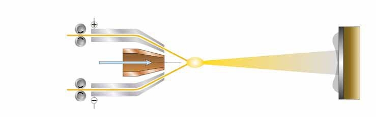 Os dois arames são electricamente carregados com polaridade oposta e na pistola de arco eléctrico, combinados, velocidades controladas. Quando os arames estão reunidos no ponto de contacto, as cargas opostas sobre os arames criam calor suficiente para a fusão continuamente das pontas dos arames. O ar comprimido é usado para pulverizar o material agora fundido e acelerá-lo até a superfície da peça para formar o revestimento.